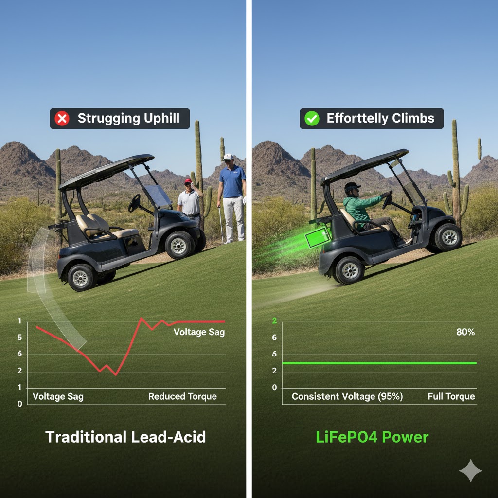 Lead-acid batteries suffer voltage sag under load, dropping from 48V to 38V as they discharge—slowing acceleration and reducing hill-climbing power. LiFePO4 maintains 95% of voltage until 80% depth of discharge (DoD), delivering consistent torque even on back-nine hills. “Our carts used to struggle on the 15th fairway incline,” notes a Arizona pro shop manager. “Now they climb at full speed, no matter the charge level.”