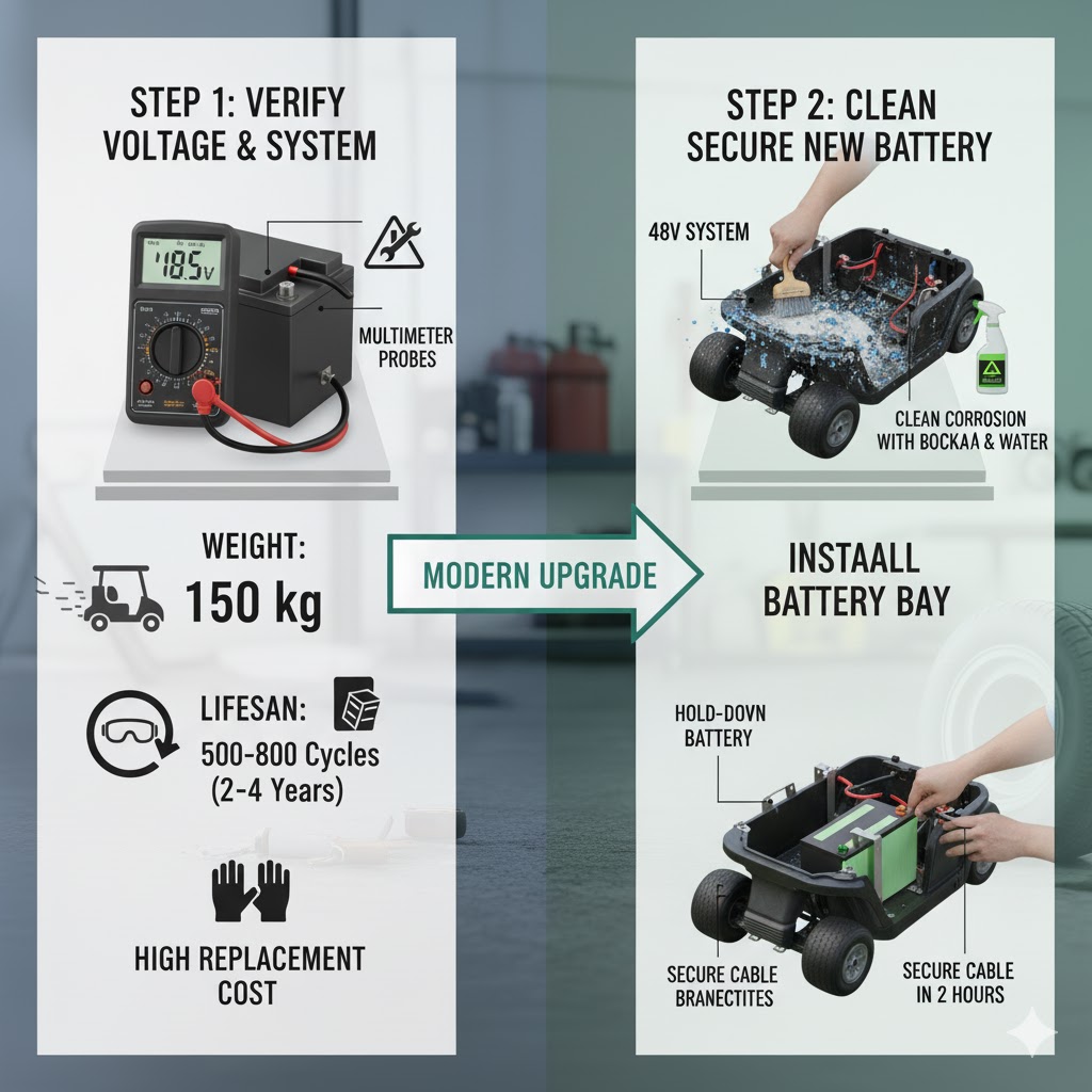 - Remove old lead-acid batteries and clean corrosion with baking soda solution.